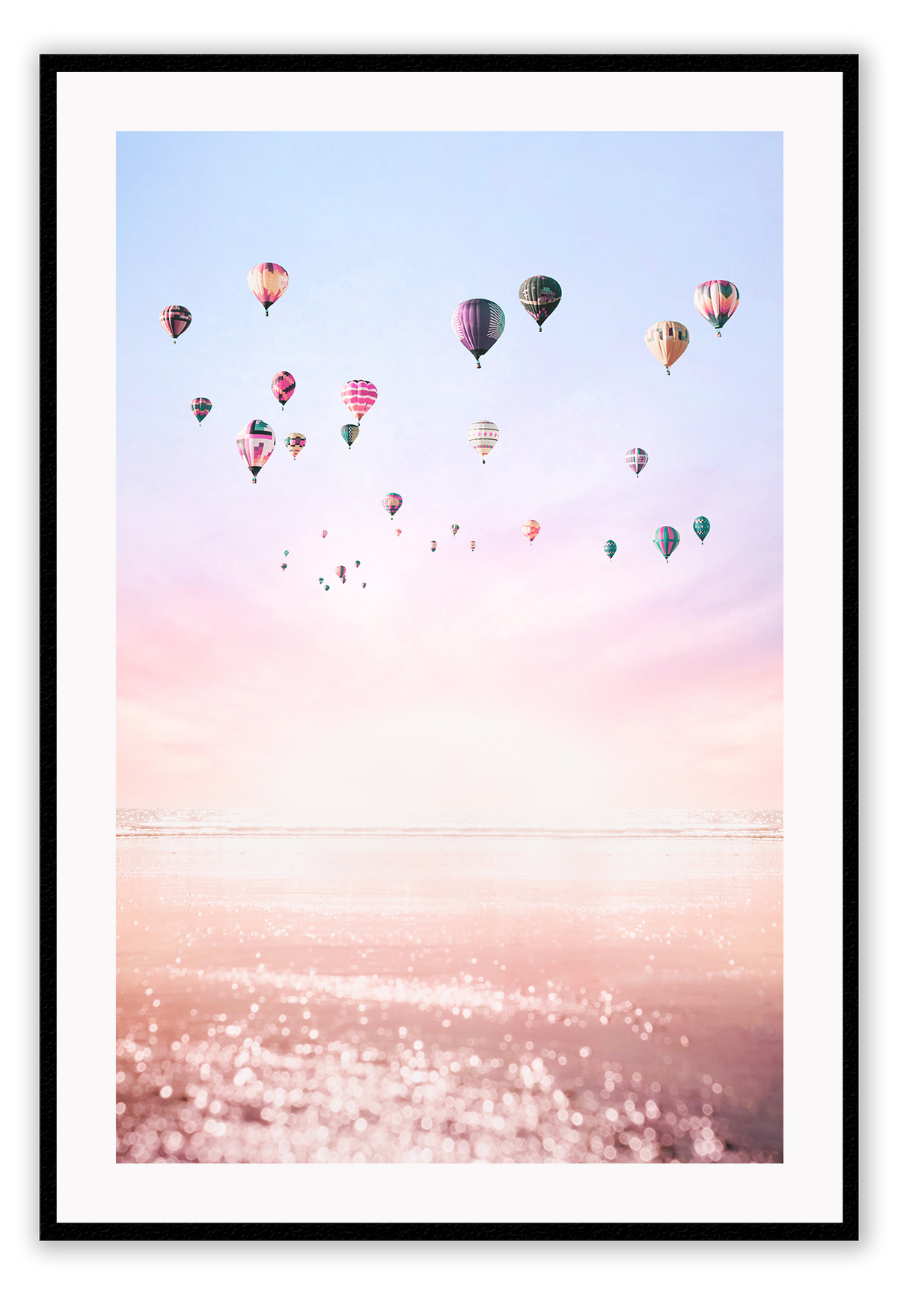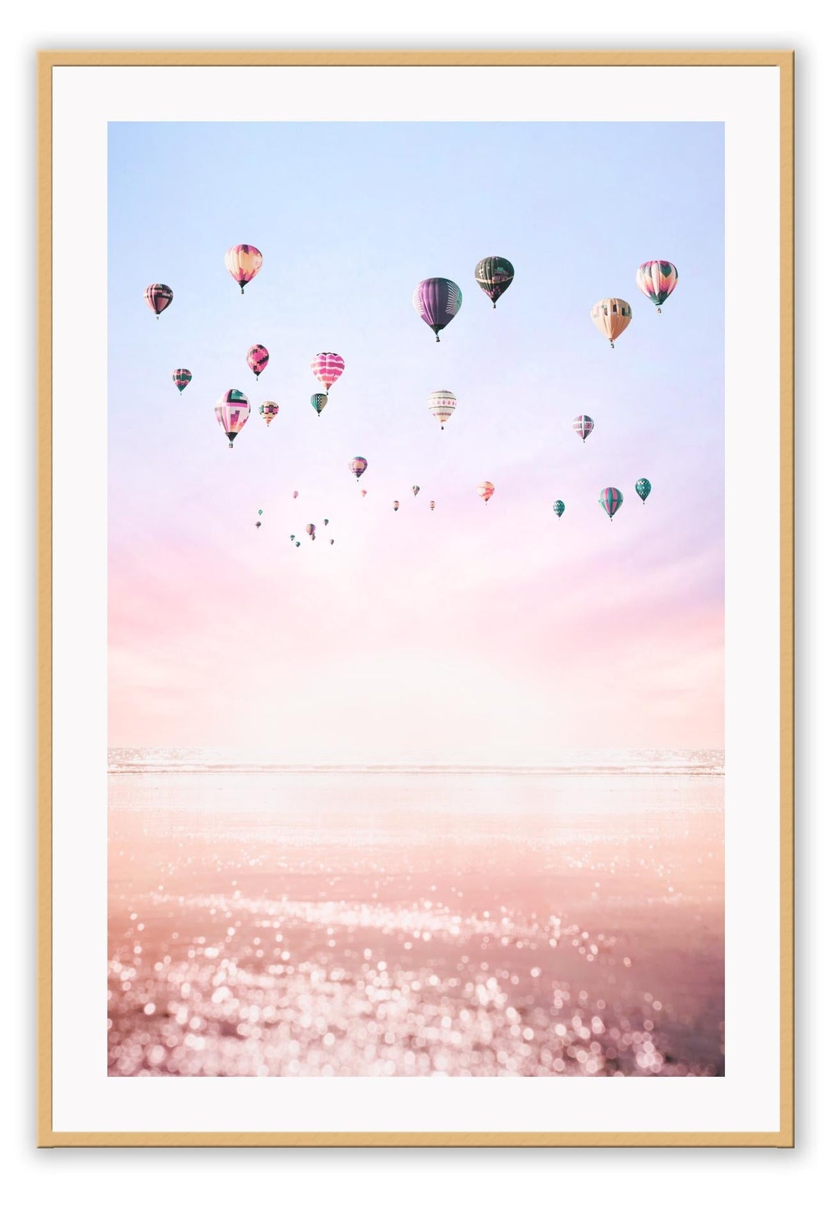 Sunset hot air ballons photography pastel colours with horizon A framed print of multiple hot air balloons floating in a pink and purple sky, with a smooth matte wood finish frame. Displayed on cream wall.