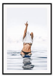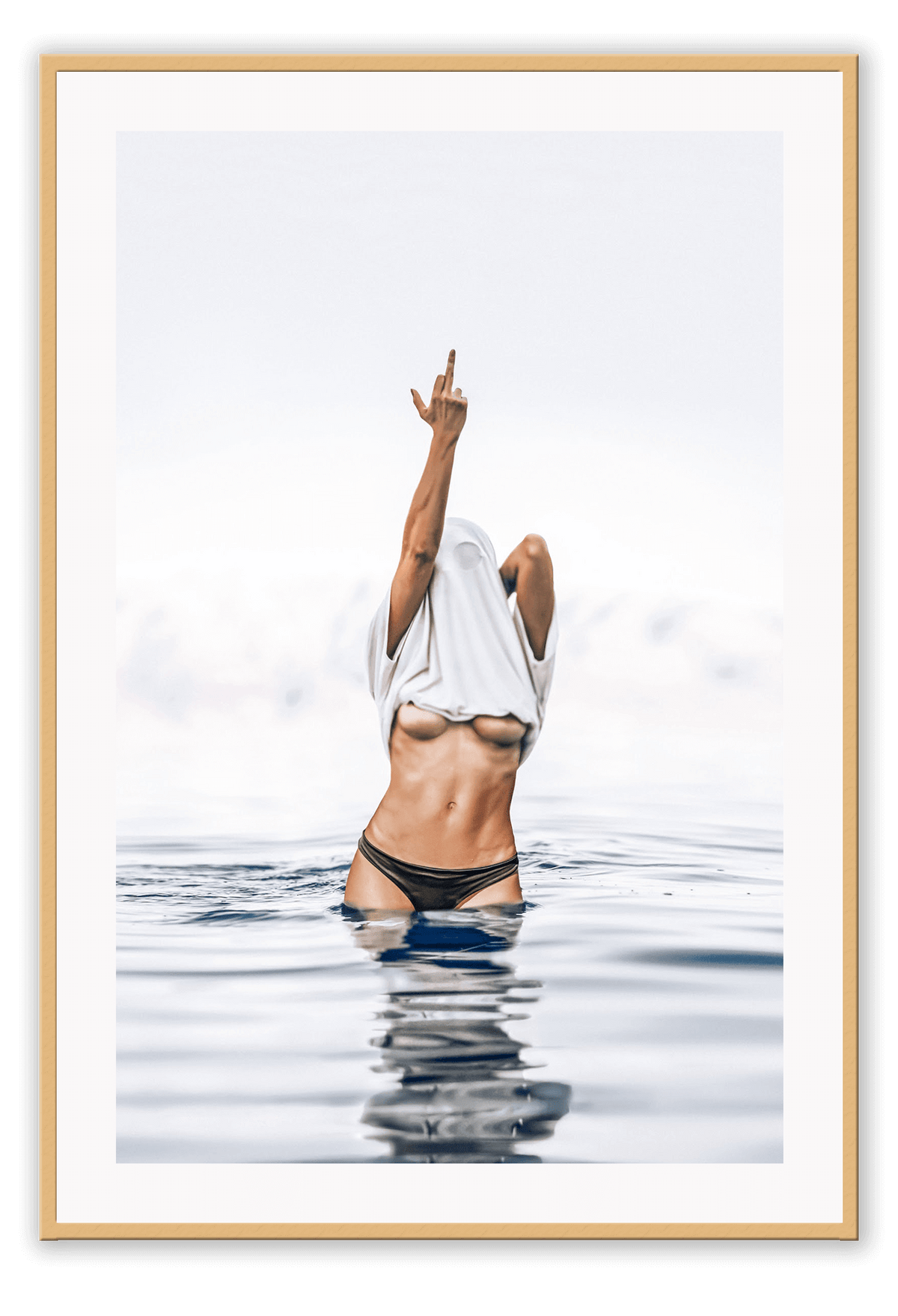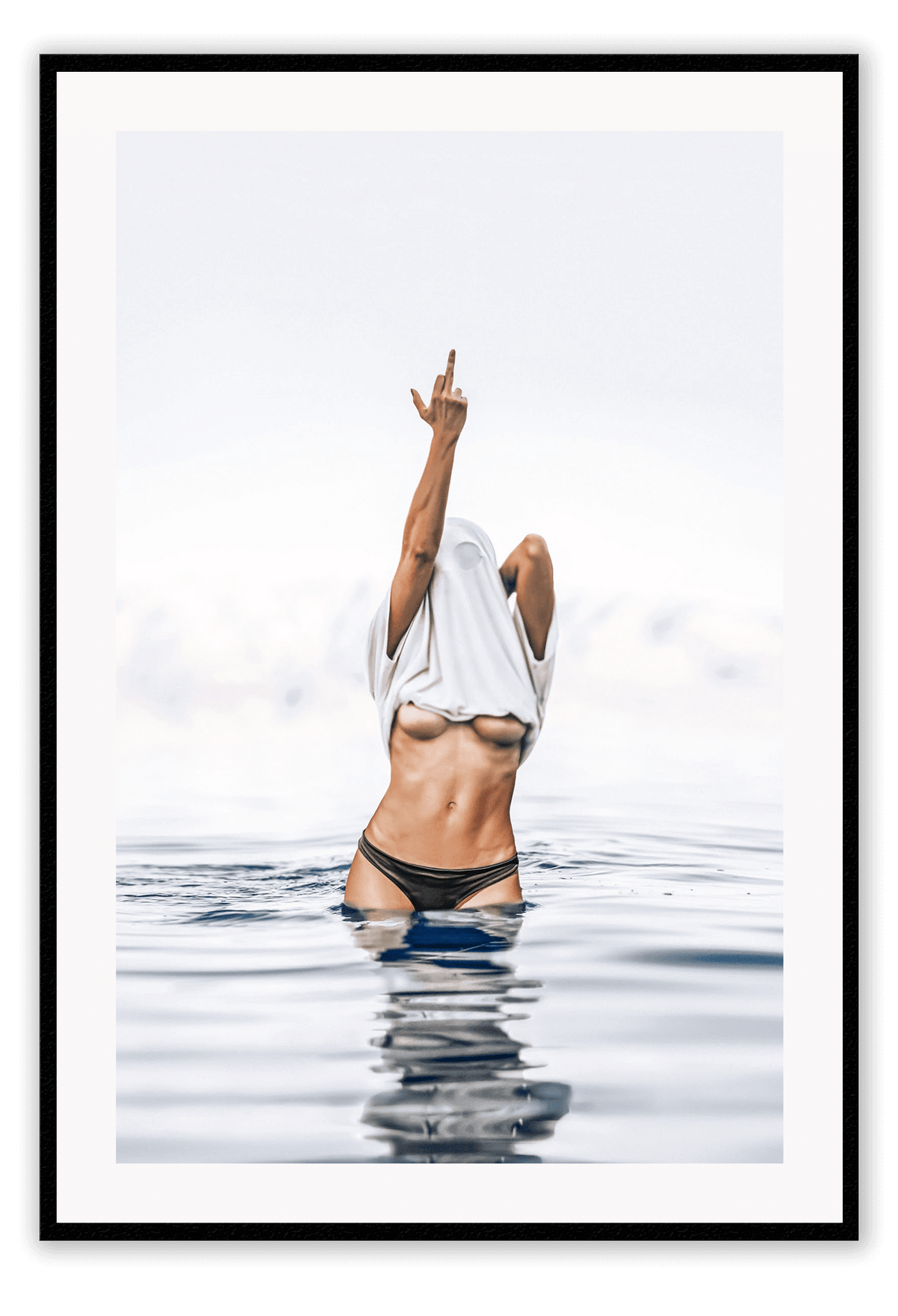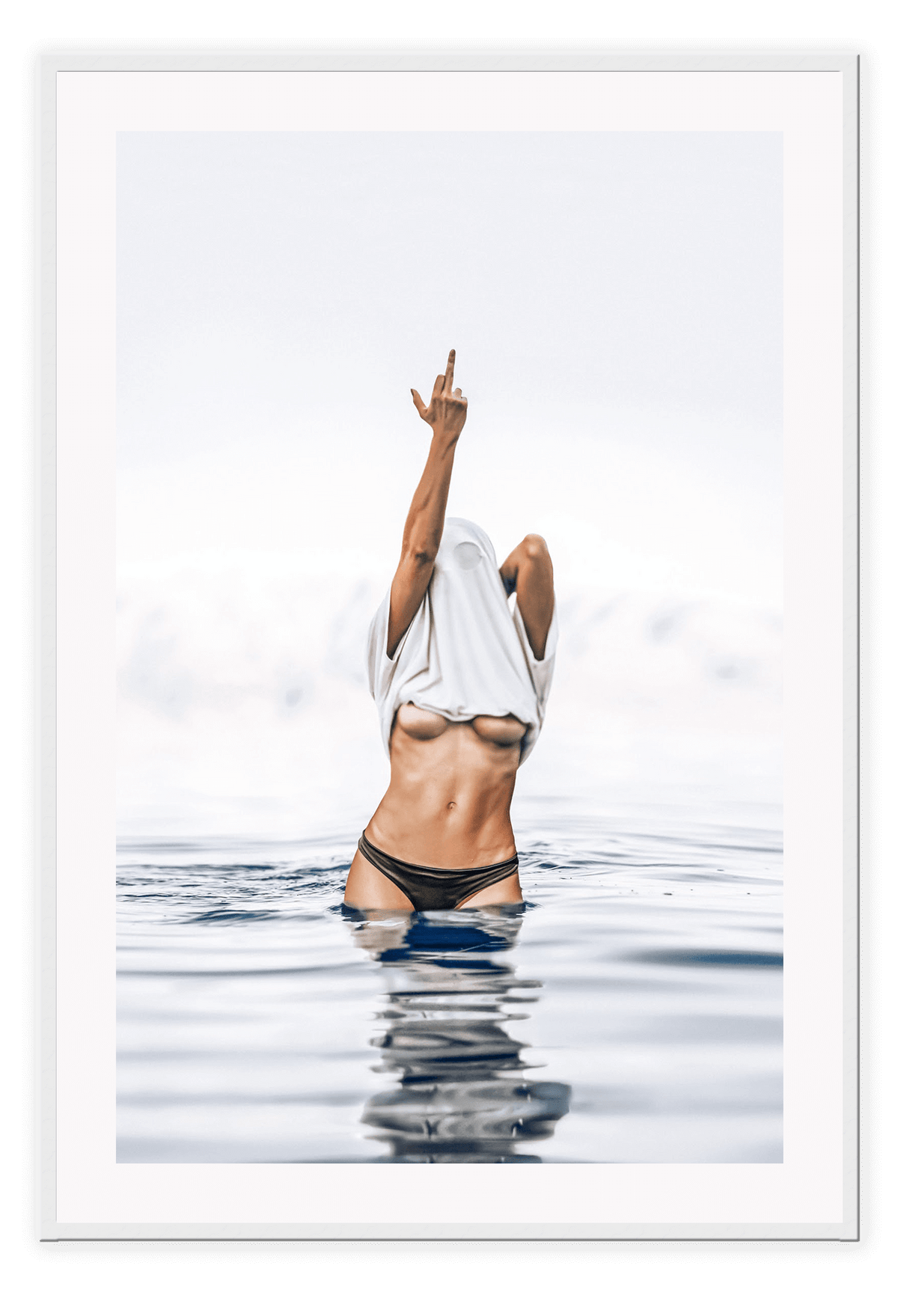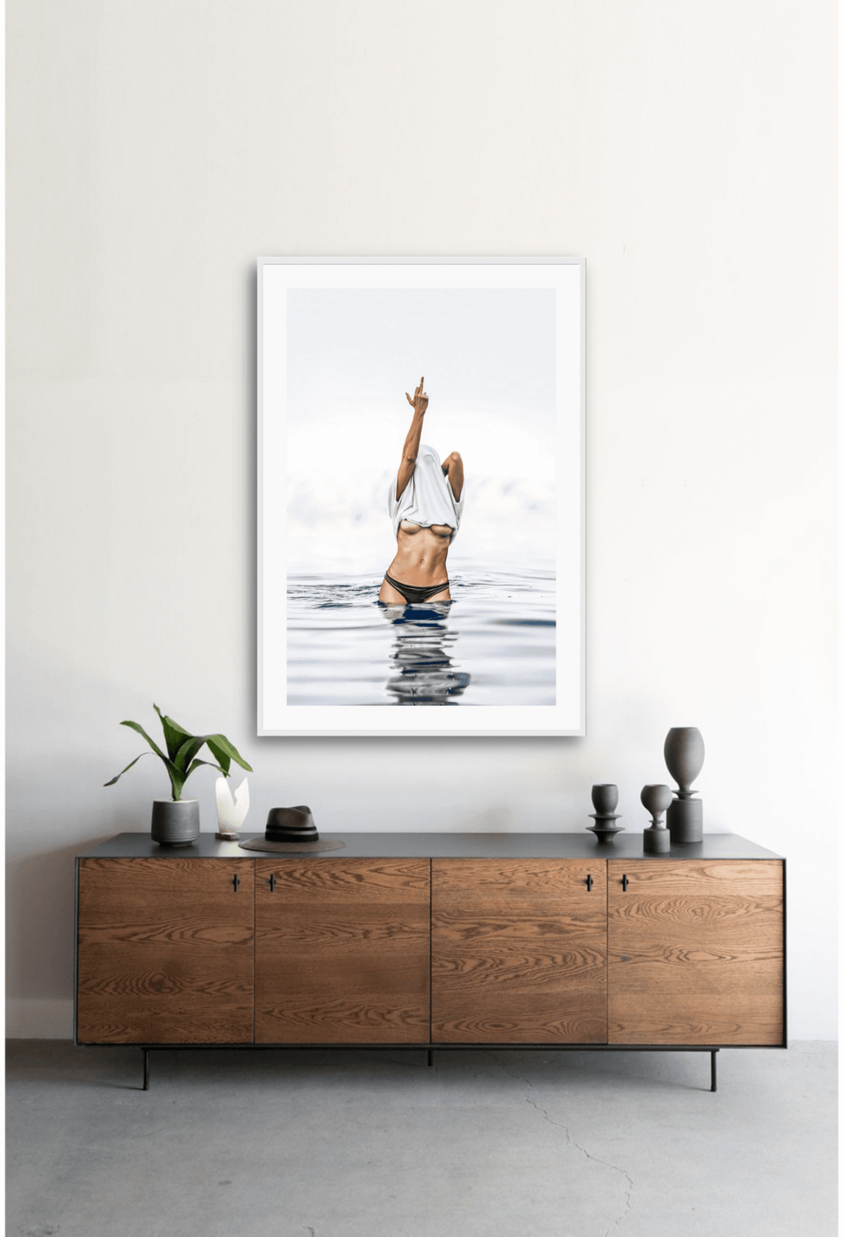 Person in black bikini standing in water with a white towel over their head, against a light gray sky. Framed artwork of a person in a swimsuit standing in water above a wooden cabinet.